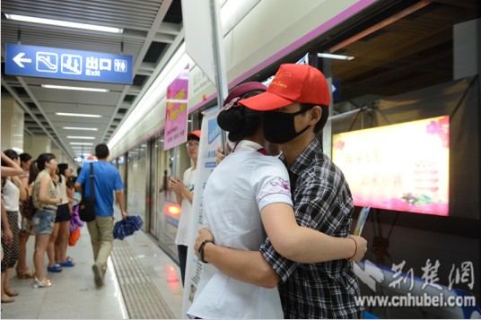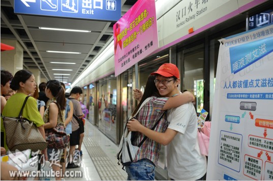 荆楚网消息(记者黄涛 通讯员 徐静东、宋涛)6月26日上午,五名志愿者在武汉市地铁二号线汉口火车站内向来往乘客征集“爱的拥抱”,倡导大家消除对艾滋病患者的歧视,同时拉开了第26个国际禁毒日宣传活动序幕。